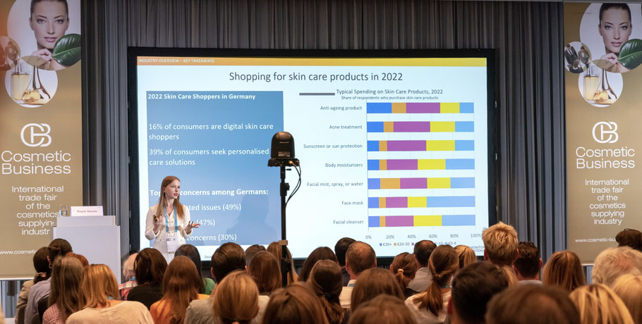 Es wurden auch einige Marktzahlen und -daten im Laufe der letzten zwei Jahre in Deutschland vorgestellt und dabei waren beispielsweise bei den Haarpflegeprodukten Produkte gegen Haarverlust und dünnes Haar, Kopfhautprobleme, graues Haar und strapaziertes Haar im Jahr 2022 am besten verkauft worden. Besonders hochpreisig waren dabei unter anderem Produkte gegen Haarverlust, Hitzeschutzspray und Haarfärbemittel. Interessant war auch, dass sich auch die jüngeren Generationen Produkte zum Schutz vor Haarverlust kaufen. Bei den Hautpflegeprodukten wurden Anti-Aging und Akne-Produkte in 2022 am besten und ebenfalls hochpreisig verkauft. Bei der dekorativen Kosmetik handelte es sich dabei vor allem um Foundation und BB und CC Creams. Des Weiteren gaben fast 70% der Teilnehmer an, nur 0-1 Make-up Produkte in der Woche zu verwenden. Das zeigt, dass die Deutschen eher Minimalisten sind. Ebenfalls war besonders interessant, dass gerade die jüngeren Generationen (Generation X, Millennials, Generation Z) mehr Geld in hochpreisige Kosmetik investieren als beispielsweise die Baby Boomer. Außerdem war überraschend, dass Generation Z und die Millennials vermehrt täglich Sonnenschutz verwenden, im Vergleich zu Generation X und den Baby Boomern.
